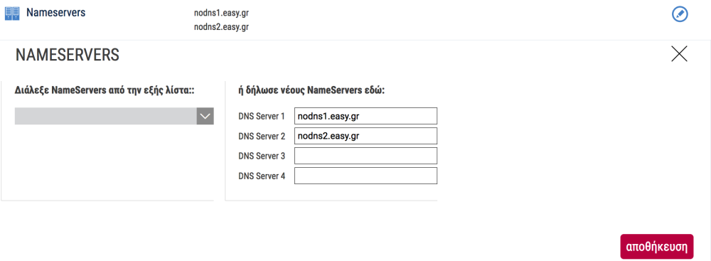 Μπορείτε να δηλώσετε νέους nameserver, να αλλάξετε αυτούς που έχει, αλλά και να προσθέσετε από τους ήδη υπάρχον που έχετε δηλώσει σε άλλα domains της καρτέλας σας