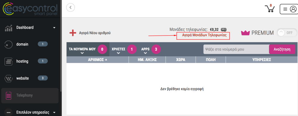 Αφού συνδεθείς στον λογαριασμό σου στο Easy.gr, και μεταβείς στο σύστημα διαχείρισης(EasyControlPanel), θα πρέπει στο tab Telephony να επιλέξεις Προσθήκη Μονάδων.