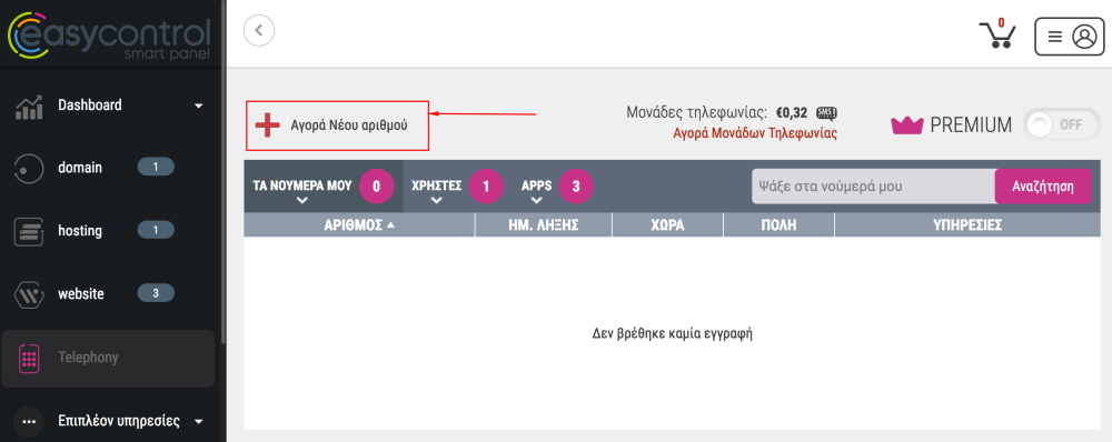 Αφού συνδεθείς στον λογαριασμό σου στο Easy.gr, και μεταβείς στο σύστημα διαχείρισης(EasyControlPanel), θα πρέπει στο tab Telephony να επιλέξεις Προσθήκη νέου αριθμού.